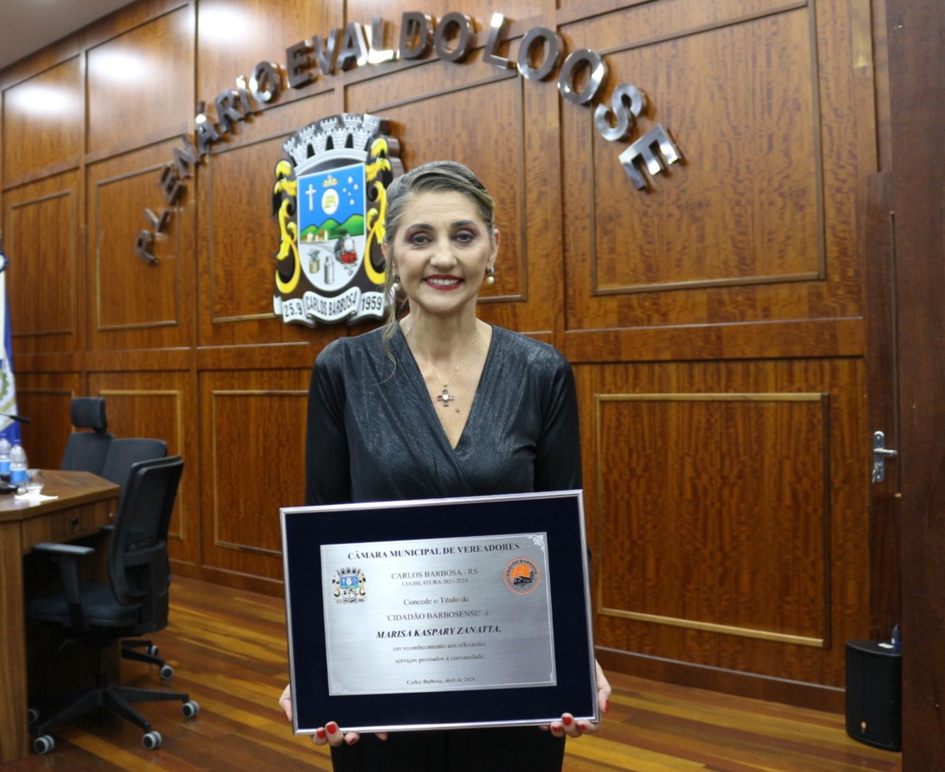 Durante a Sessão Comemorativa realizada na noite de ontem, 16, no Plenário Evaldo Loose, os vereadores barbosenses realizaram a entrega do título de Cidadão Barbosense a Marisa Kaspary Zanatta, pelos relevantes serviços prestados ao município