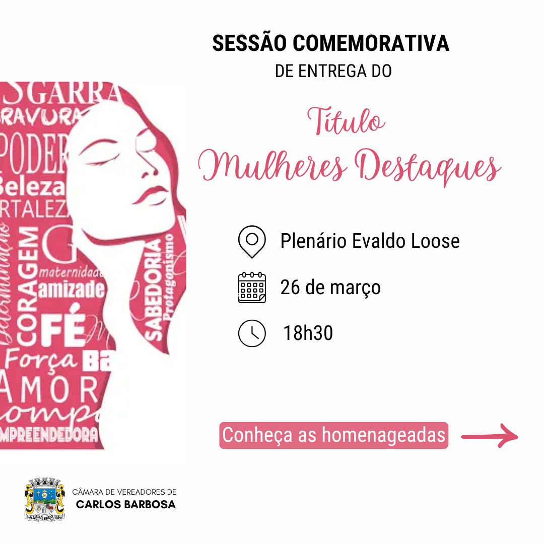 A entrega dos Títulos será no dia 26 de março, às 18h30, no Plenário Evaldo Loose da Câmara de Vereadores de Carlos Barbosa.